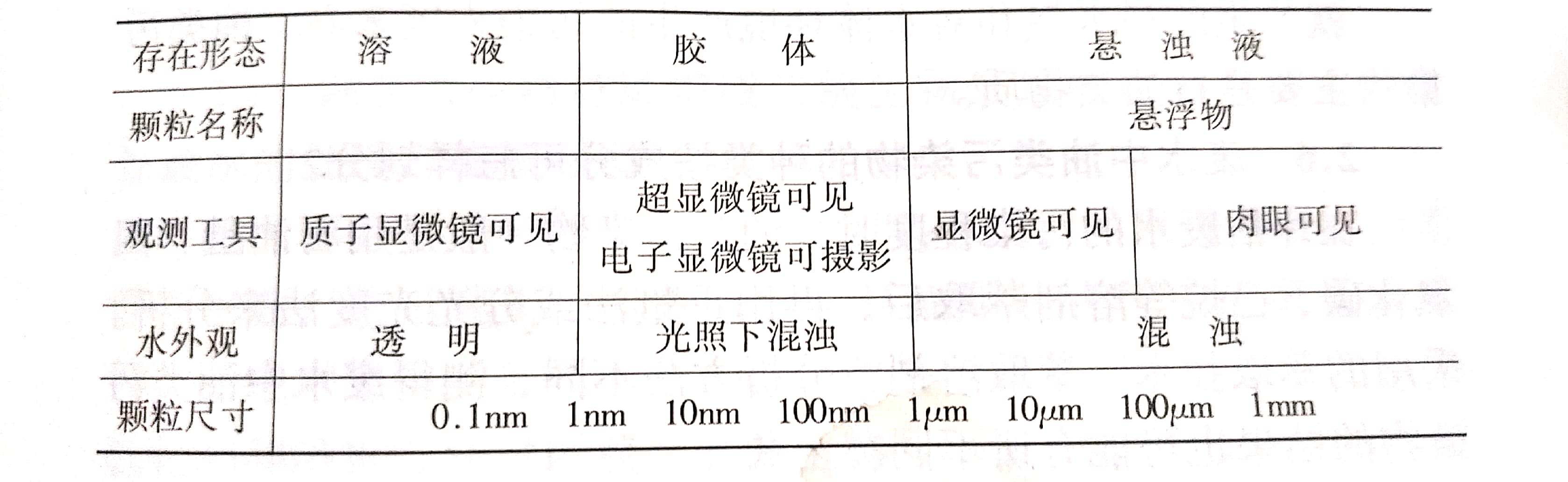 廢水中雜質(zhì)顆粒按存在形態(tài)可以分為懸浮物質(zhì)、膠體物質(zhì)和溶解性物質(zhì)等三種,其具體分散狀態(tài)和尺寸見(jiàn)下圖: